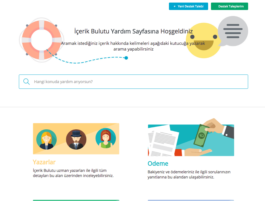 Merkezi’nin haricinde bir de Yardım Merkezimiz var. İçerik Bulutu Yardım Merkezi; yazar, yayıncı ve editörlerimizin akıllı ekranları ve sistem işleyişi hakkında pek çok bilgi edinmesine yardımcı oluyor.