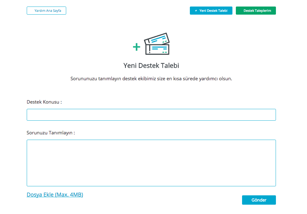 -Her bir destek talebiniz yani biletiniz için maksimum 4 mb boyutunda bir dosya ekleyebileceksiniz. Böylece sorunuzu ekran görüntüleri, farklı görseller ya da belgeler ile daha açık hale getirebilirsiniz.