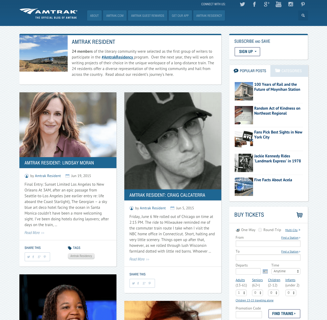 Düzenli olarak güncellenen Amtrak, residency programı ile 24 adet profesyonel yazara ve bloggera ev sahipliği yapıyor. Yazarlar Amtrak aracılığı ile kendi projelerini ve hikayelerini anlatma şansı yakalarken, blogta yayınlanan ve yazarlara ait bu deneyimler de okuyuculara ışık tutuyor.
