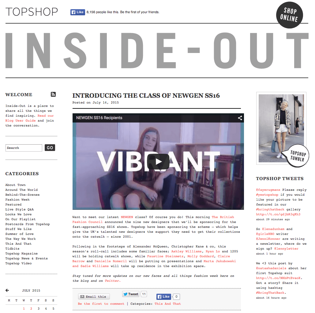 Topshop’un blogu oldukça klasik bir görünüşe sahip ve bağımsız bir blog hissi uyandırıyor. Courier fontları ve sade tasarımı ile ücretsiz WordPress şablonlarında yapılmış gibi. Açıkçasını söylemek gerekirse aslında böylesi çok daha iyi.  ‘Insıde Out’ daha çok özgün, ilgi çekici ve güvenilir içeriği ile öne çıkıyor.