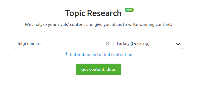 Ne yazmak istediğinize dair bir fikriniz olabilir, ancak konuyu hangi bakış açısı ile ele almak istediğinize de karar vermelisiniz. Araştırmaya başlamak için tek yapmanız gereken, Topic Research’te bir anahtar kelime veya kelime öbeği aratmak. Örneğin “bilgi mimarisi” ile ilgili bir yazı yazmak istediğinizi varsayalım: