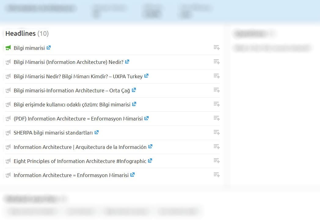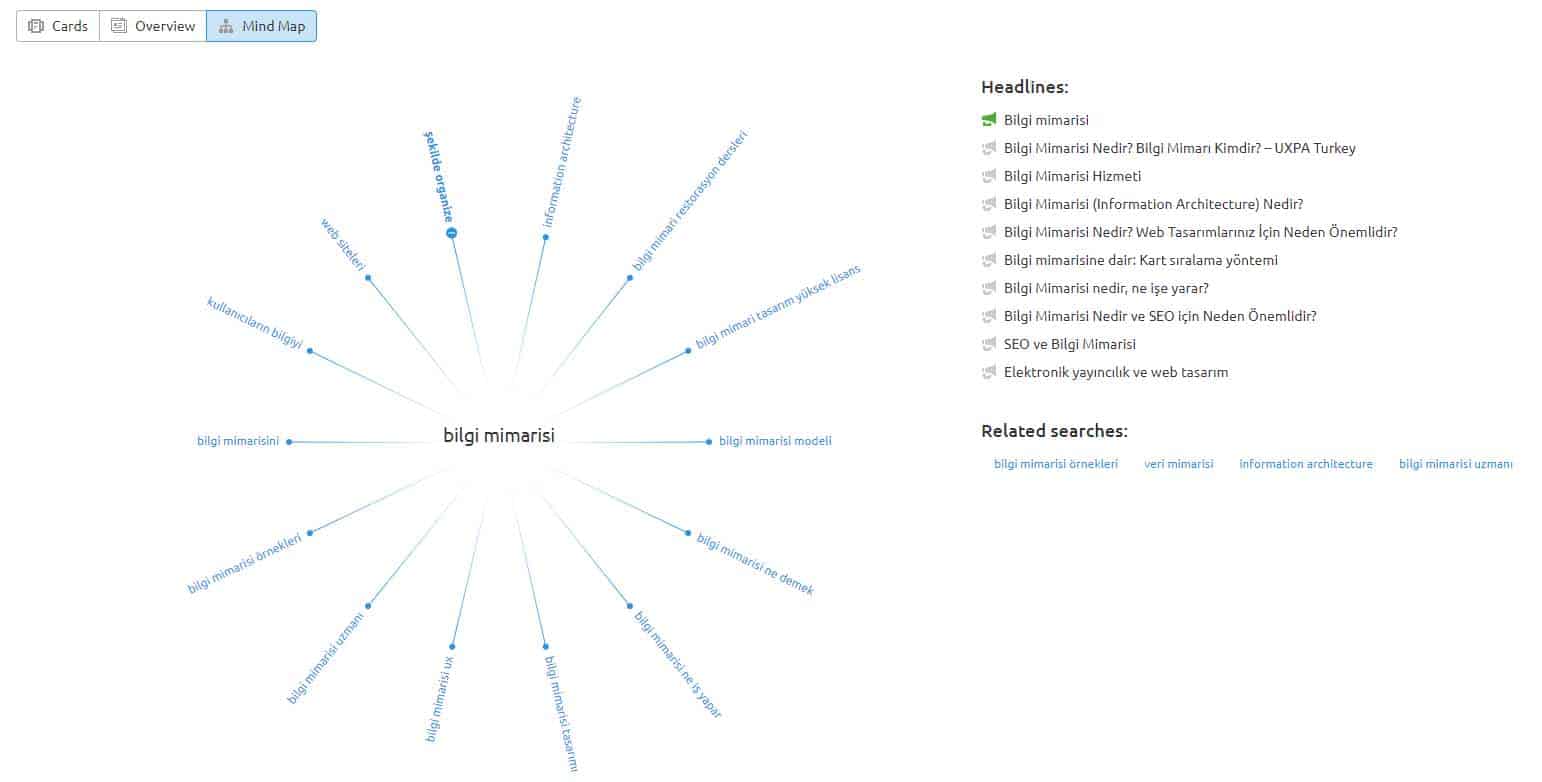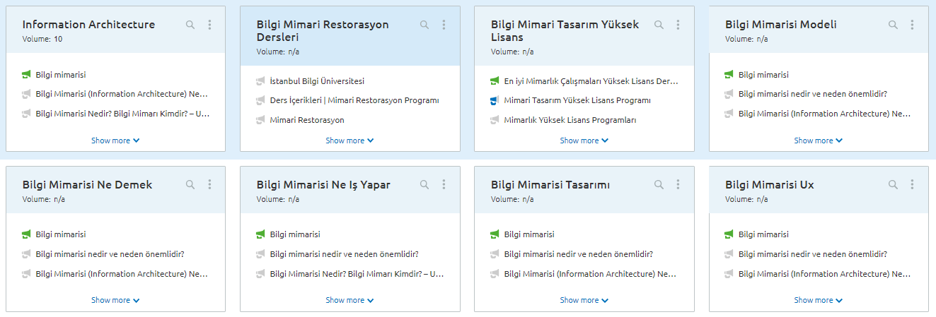 Topic Research size “bilgi mimarisi” konu başlığı ile ilgili farklı bakış açıları kazandırabilen altbilgileri olan kartlar gösterir. Oluşturacağınız yazı içinde ilgili olabileceğini düşündüğünüz bu alt konu başlıklarını da geçirebilirsiniz:
