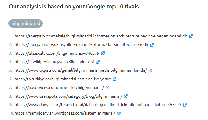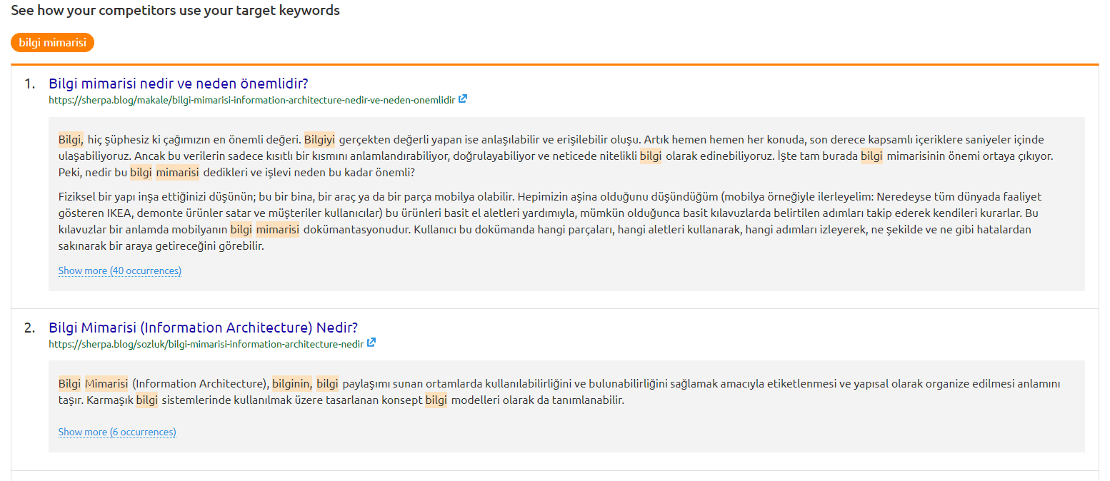 SEO İçerik Şablonu sayesinde rakiplerinizin hangi anahtar kelimeleri hedeflediğini ve içeriklerinde bunları nasıl geçirdiklerini görebilirsiniz. Her içeriği tek tek incelemek zorunda değilsiniz, ihtiyacınız olan bütün bilgi tek bir sayfada karşınıza geliyor: