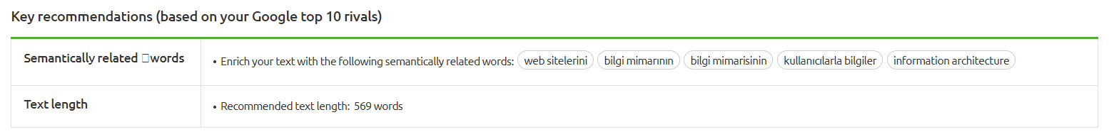 “Key Recommendations” (Önemli Öneriler) bölümünü inceleyerek birbiriyle semantik olarak ilişkili olan anahtar kelimeleri anlamlı şekillerde kullanarak içeriğinizi zenginleştirebilir, içerik uzunluğunu ideal noktaya getirebilir ve okunabilirlik skorunuzu yükseltebilirsiniz. Böylece hem kullanıcı dostu bir içerik üretmiş olursunuz hem de backlink alma şansınız artar.