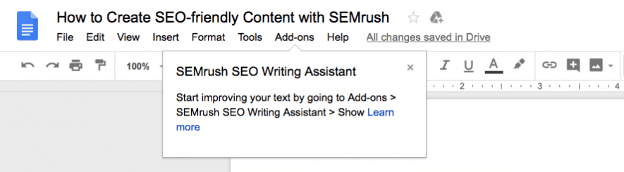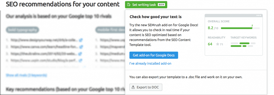 Bu özelliği ayarlamak için SEMrush SEO İçerik Şablonu aracının içinden “Set writing task” butonuna tıklamalısınız. Sonrasında “Get add-on for Google Docs” ifadesine tıklayarak Google Chrome Web Store’dan eklentiyi kurabilirsiniz.