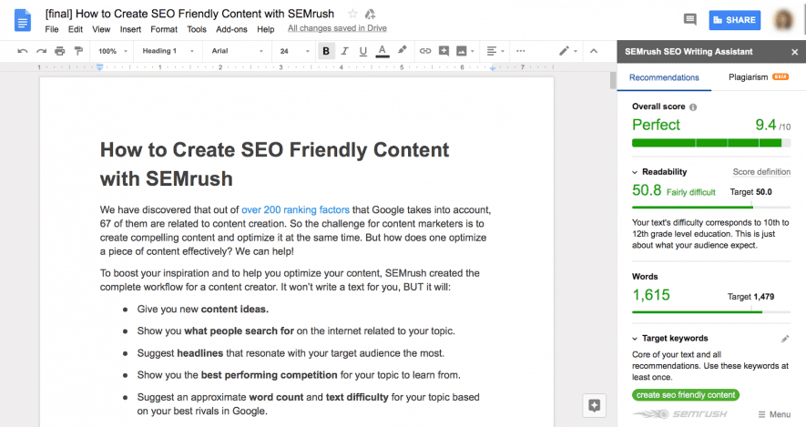 SEMrush kullanarak SEO uyumlu içerik üretmek için kullanabileceğiniz araçlar yukarıda bahsi geçenlerle sınırlı değil. Dilerseniz gerçek zamanlı olarak, bir Google dokümanında ya da WordPress blogunuzda hazırladığınız taslağı kontrol edebilirsiniz. “SEO Writing Assistant” isimli bu araç, içeriğinizin SEO uyumlu olup olmadığını tespit etmenizi sağlıyor.