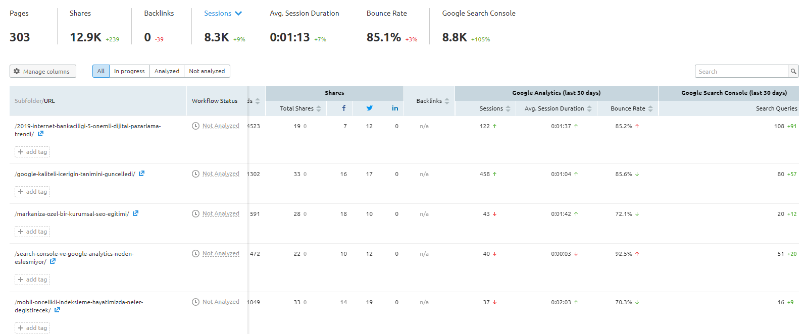 SEMrush, içeriğiniz yayımlandıktan sonra etkileşimini ve performansını takip edebileceğiniz araçlara sahip. Örneğin “Content Analyzer” bölümünden sitenize ait içeriklerin Facebook, LinkedIn ve Twitter’daki paylaşım sayılarını görebilir, Google Analytics ve Search Console hesabından önemli performans metriklerini takip edebilirsiniz.