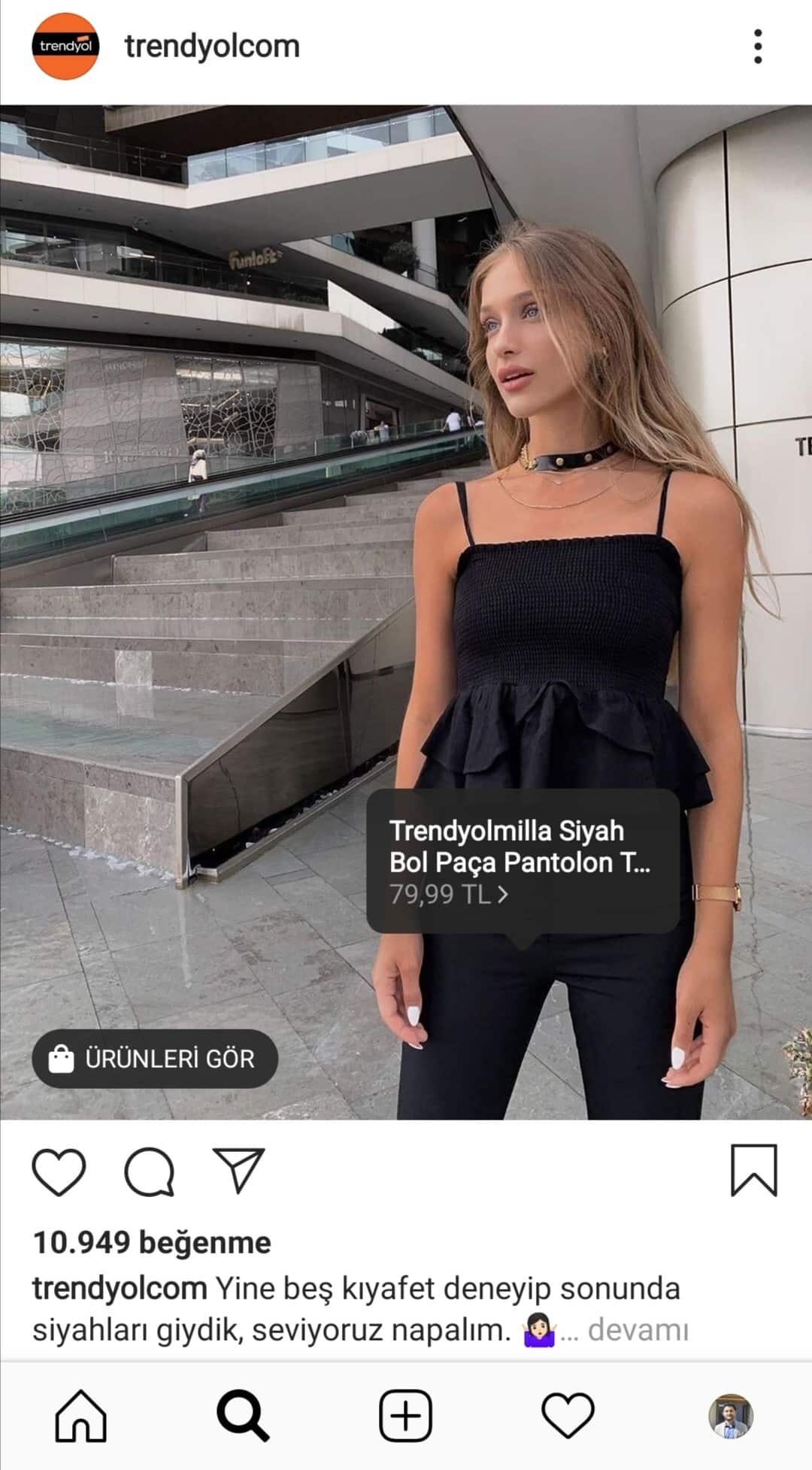 Trendyol bunu en çok kullanan markalardan biridir. İsimlerine güvenilirlik kazandırmak için sosyal medya Influencer’larını kullanırlar. Aşağıdaki gönderide 224.000’den fazla takipçisi bulunan bir Influencer’ı kullanmışlar.