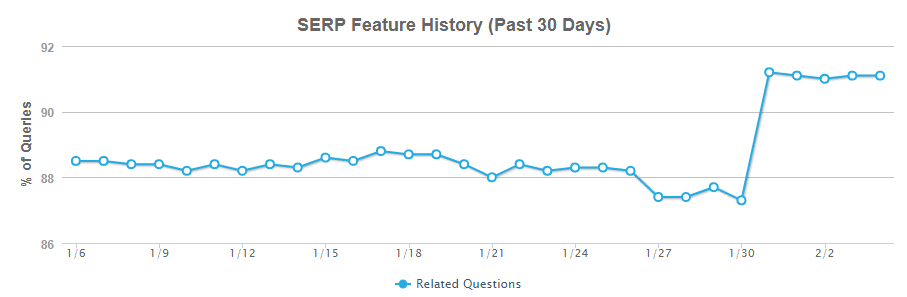 Kullanıcılar Bunları da Sordu (People Also Ask, PAA) kutuları 2016’da ilk çıktıklarından beri gitgide yaygınlaşan bir SERP (Arama Motoru Sonuç Sayfası) özelliğidir. Aslında Mozcast’ten yakın tarihli veriler, PAA’nın görüntüledikleri aramanın yaklaşık %90’ını meydana getirdiğini gösterir.