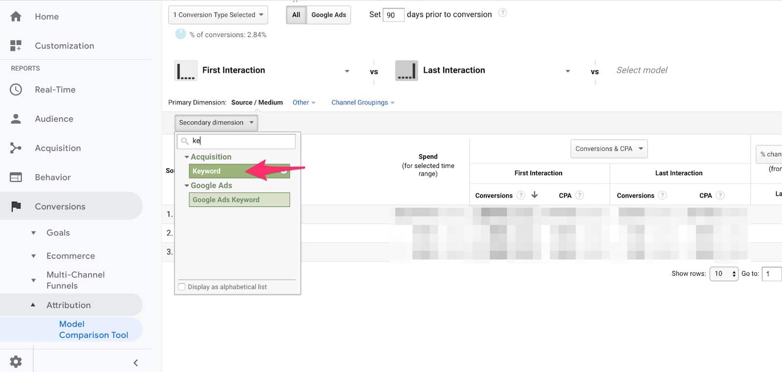 “Paid Search” kategorisine tıkladıktan sonra, ikincil boyut sekmesini kullanın ve dönüşüm getiren anahtar kelimelerin listesini almak için anahtar kelime seceneğini tıklayın.