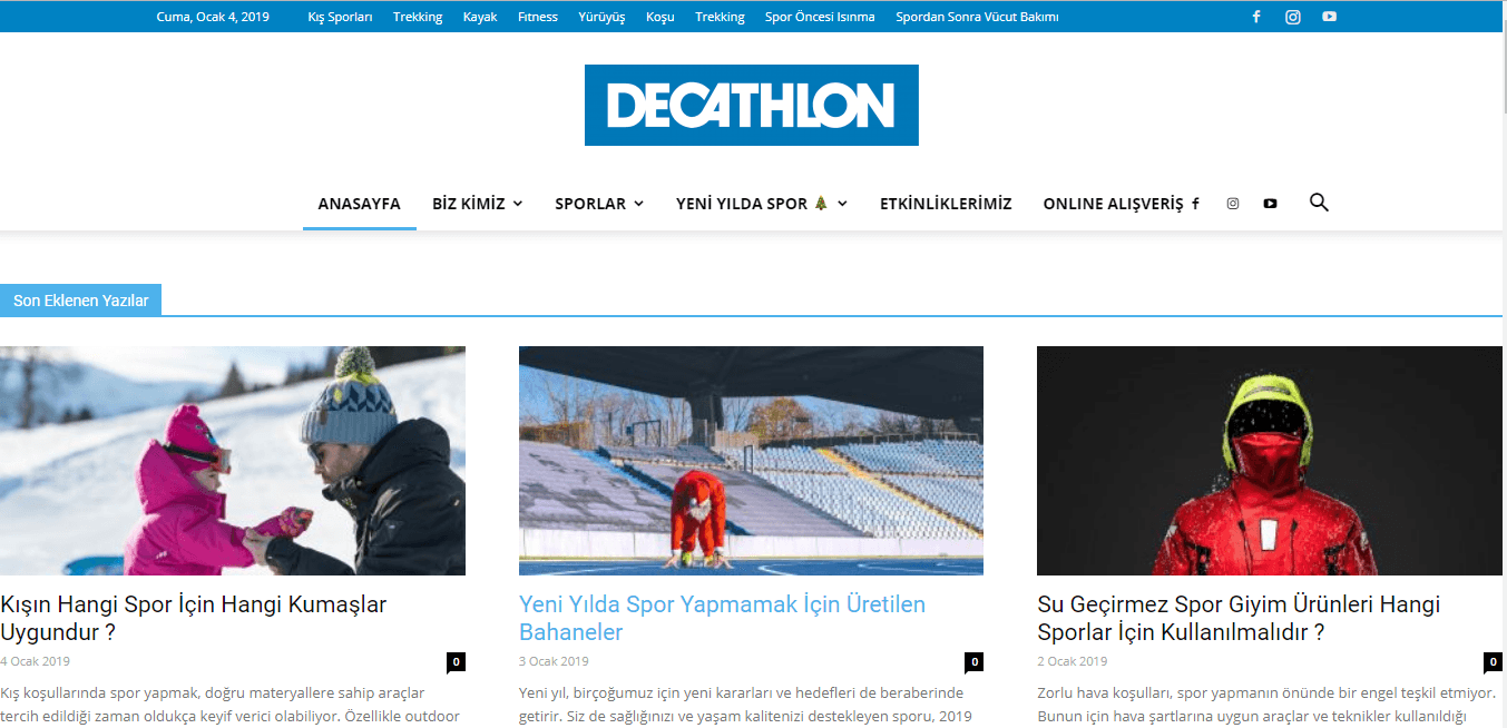 Bir çok farklı markanın spor ekipmanlarını satan Decathlon, blogunda trekking, kayak, fitness, koşu, futbol, masa tenisi, yürüyüş, bisiklet, seyahat, hatta kamp yapmak için için ipuçları, karşılaştırmalar ve adım adım rehberler sunuyor.
