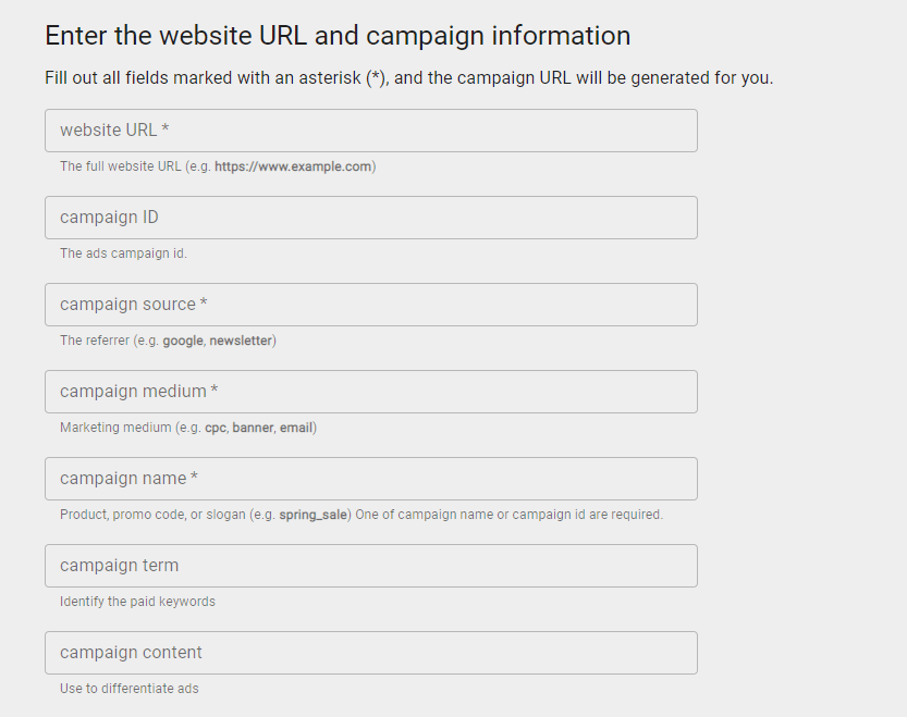 Kullanmak için web sitenizin adresini girmeniz yeterlidir. Ardından görseldeki alanlara uygun UTM parametrelerinin geri kalanı isteğe bağlı olarak düzenlenir.