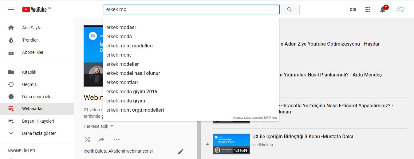 Erkek montu satan bir markaysanız ve ürününüzü anlatan bir video paylaşacaksanız, arama butonuna ürününüzle alakalı “Erkek Mo…” yazdığınızda çıkan sonuçları kullanabilirsiniz. Bunun içinYouTube’un otomatik doldurma özelliğinden faydalanın. YouTube’da başkalarının ne yazdıklarını görebilirsiniz. YouTube popüler arama terimlerini temel alarak otomatik olarak doldurur.